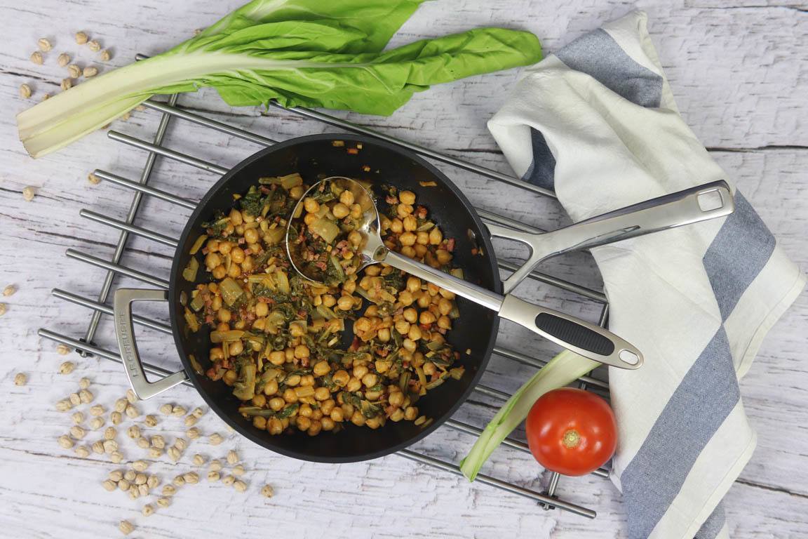 Los garbanzos con acelgas son un plato muy completo y muy nutritivo. Al utilizar los garbanzos en conserva no necesitas cocinar las acelgas aparte. Puedes incluso cocinar todo junto en pocos minutos.