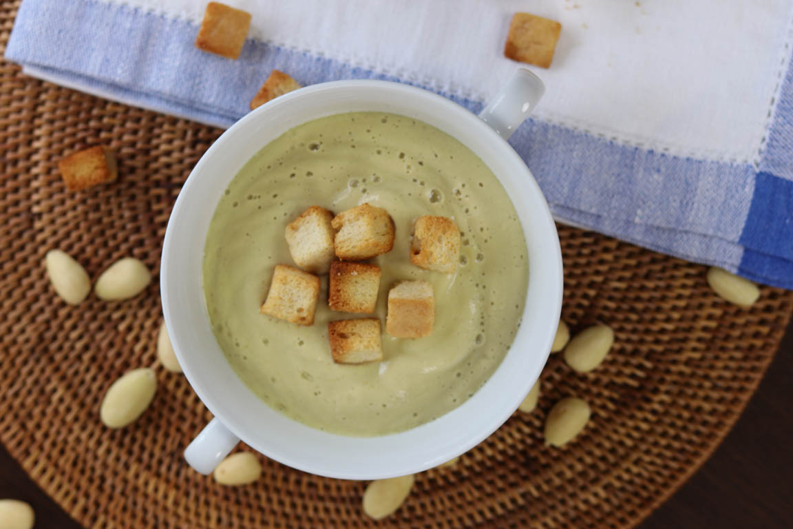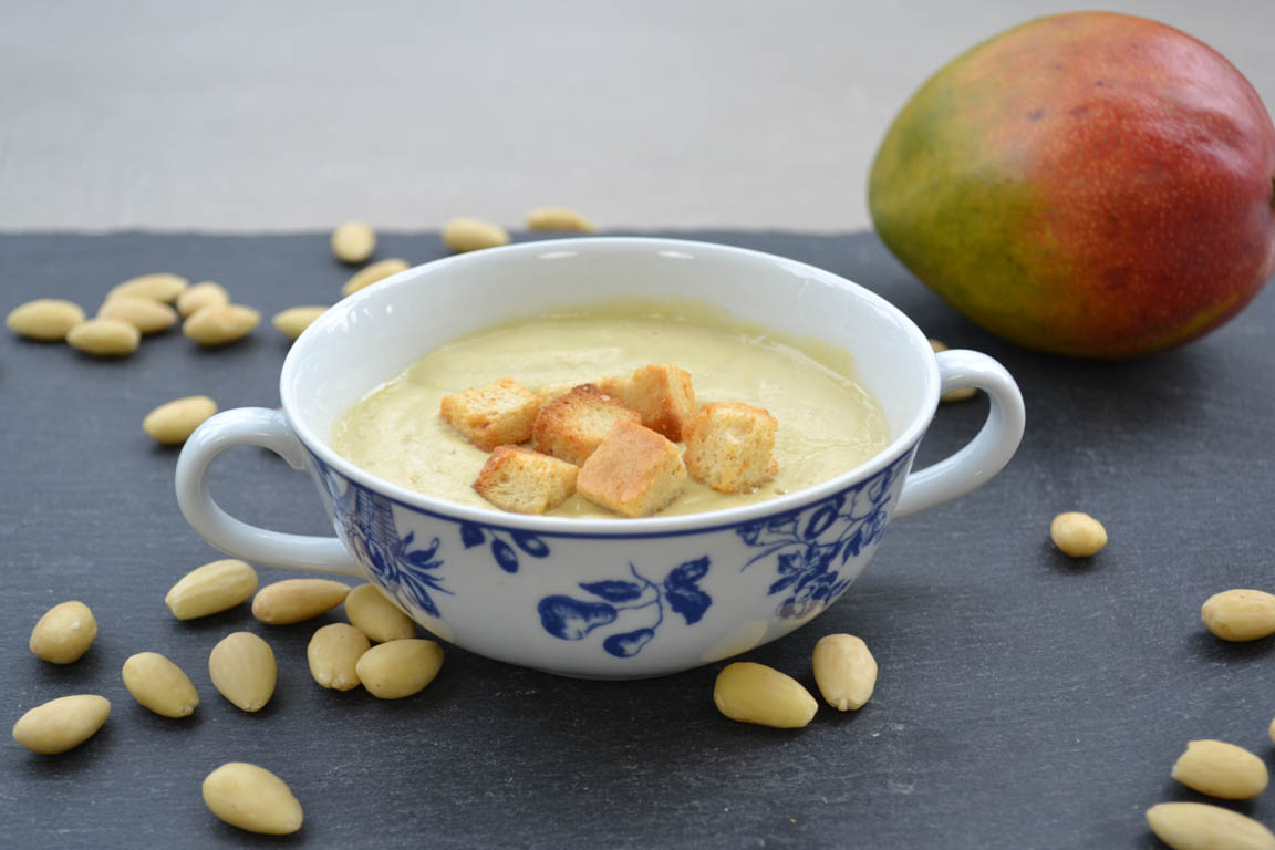 Receta para preparar una sopa fría diferente. En este caso tomamos como base la receta del ajoblanco y le añadimos mango para conseguir un sabor diferente.