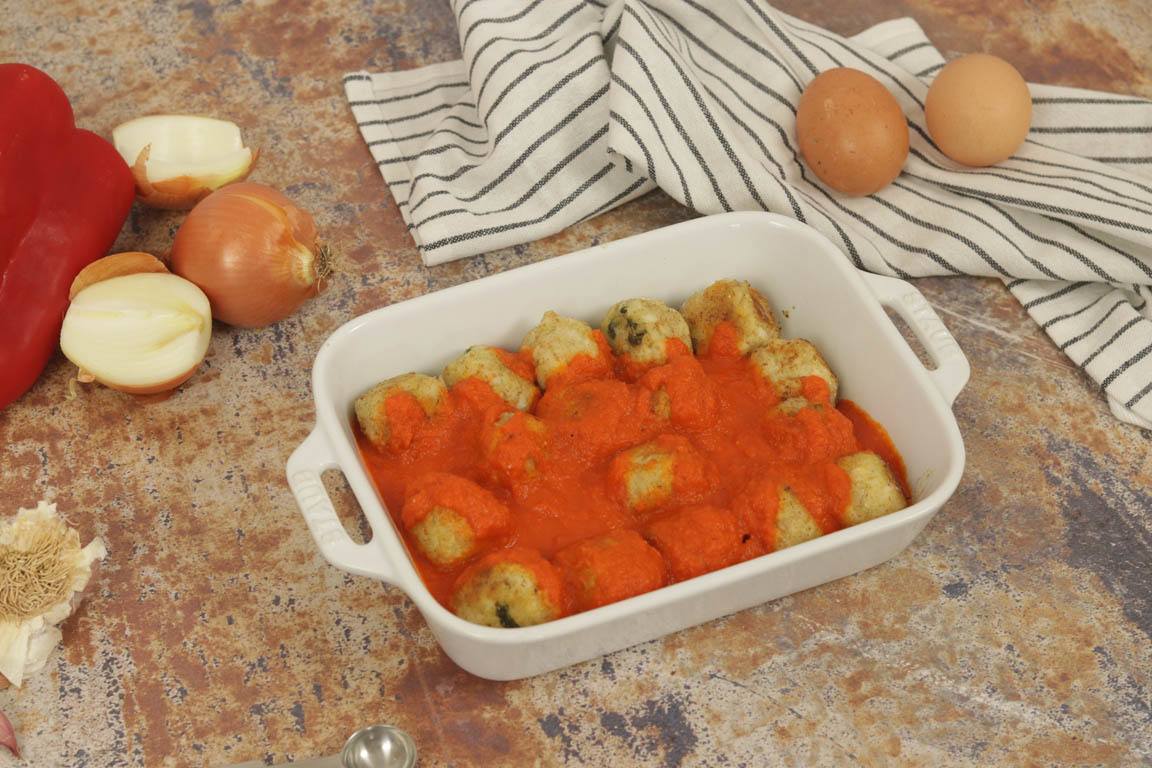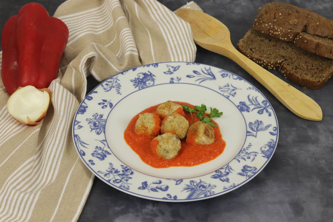 ALBÓNDIGAS DE MERLUZA CON SALSA DE PIMIENTOS