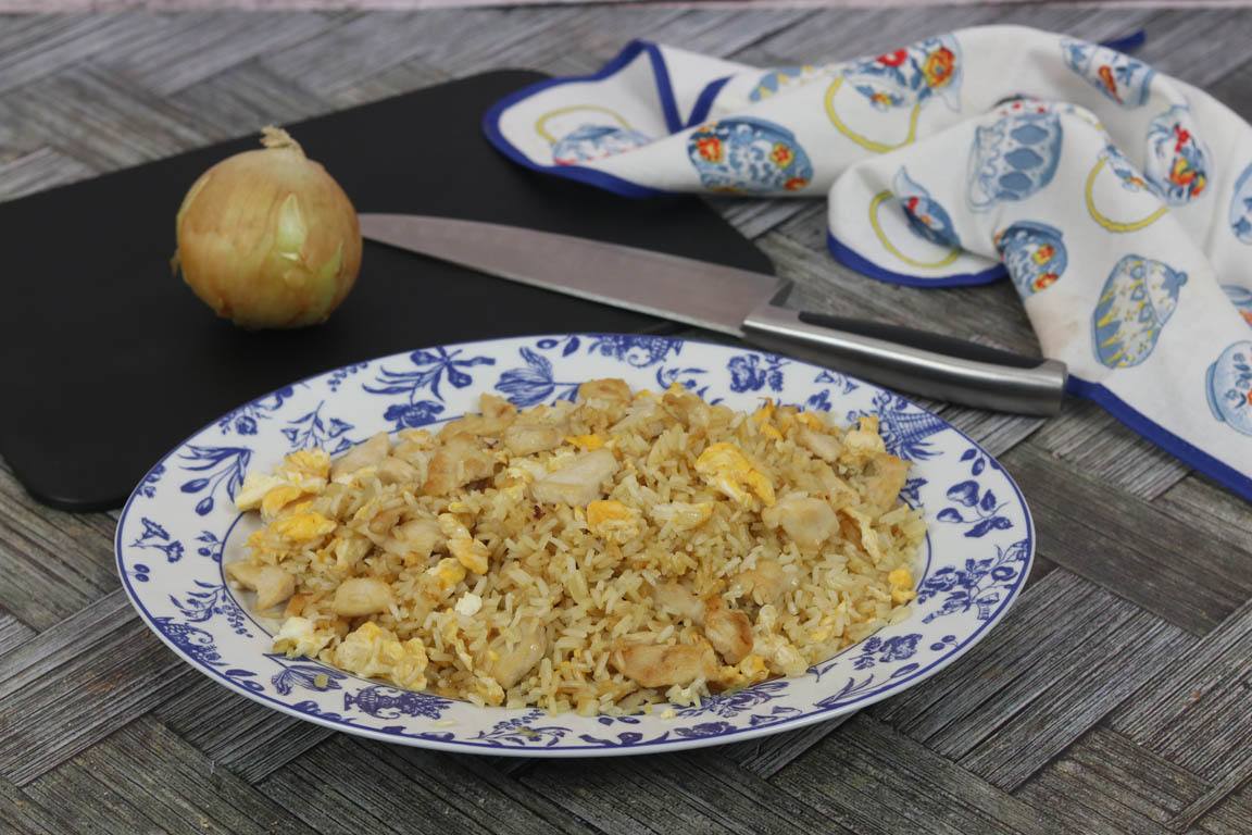 Receta de arroz frito muy completo para poder tomar como plato único. El arroz frito estilo oriental o estilo chino es una buena forma de aprovechar el arroz blanco que nos ha sobrado para poder preparar una receta completa añadiendo ingredientes como verduras, tortilla y pollo.