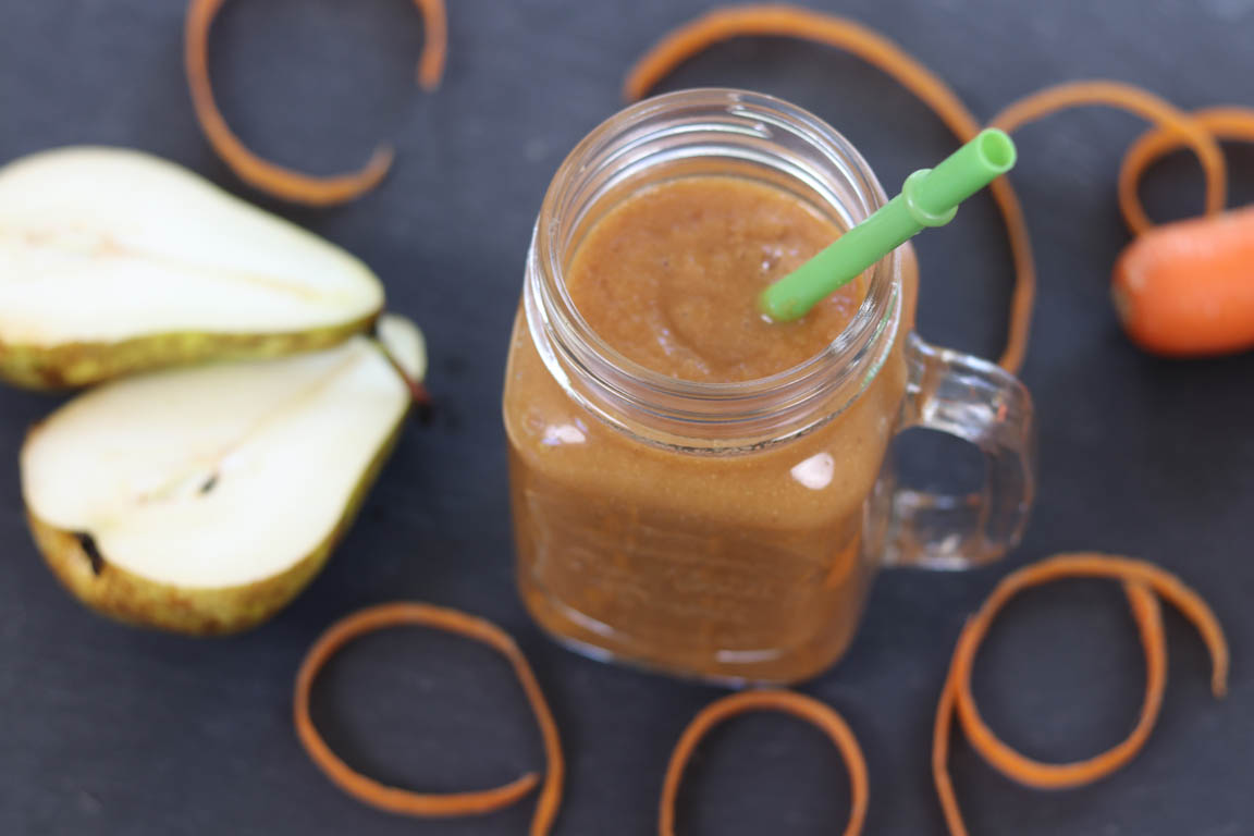 Receta para preparar un smoothie dulce, muy rápido y fácil de preparar. La combinación de pera y zanahoria da un sabor muy dulce al batido, que además contiene una alta cantidad de fibra por lo que nos ayuda a regular el azúcar en sangre y también el tránsito intestinal.