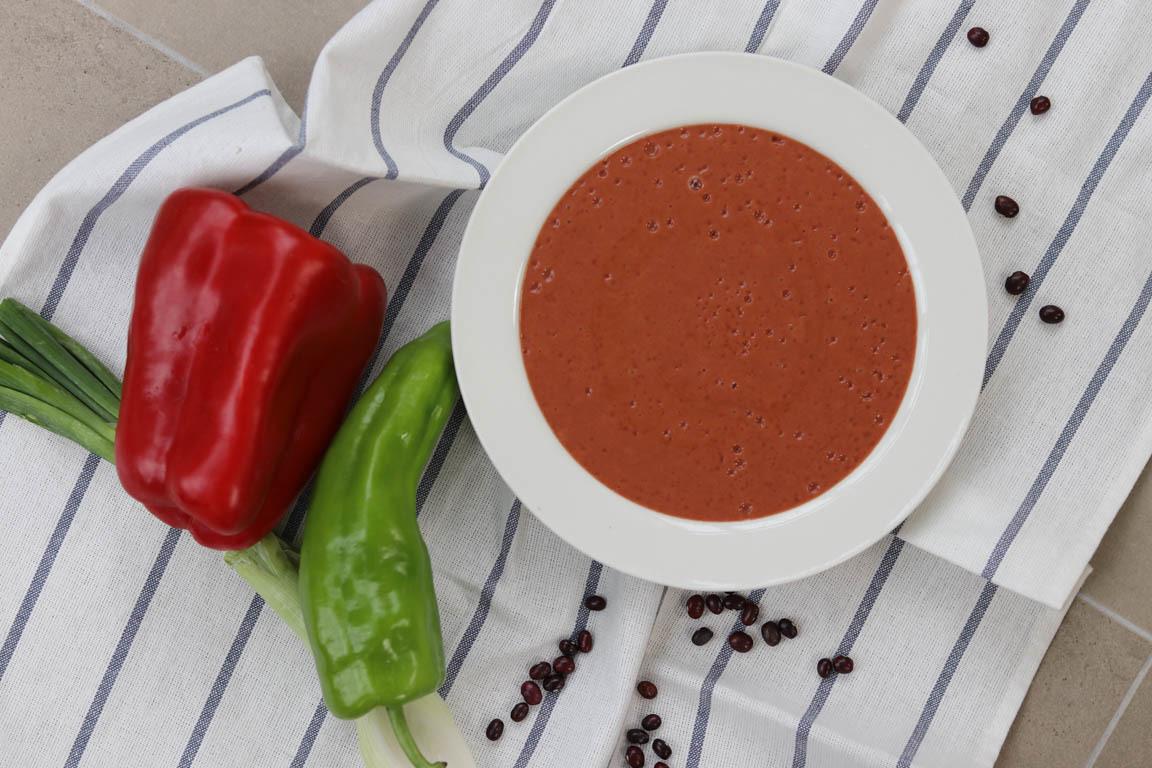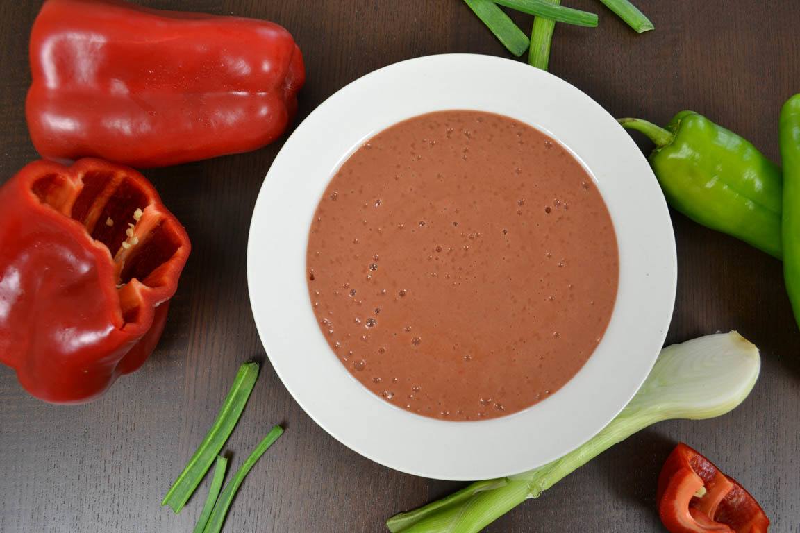 Receta para preparar un crema de alubias muy rápida. Podemos utilizar un bote de conserva de alubia y añadirle verduras crudas, en este caso cebolleta y pimiento rojo y verde para aumentar la cantidad de nutrientes del plato.