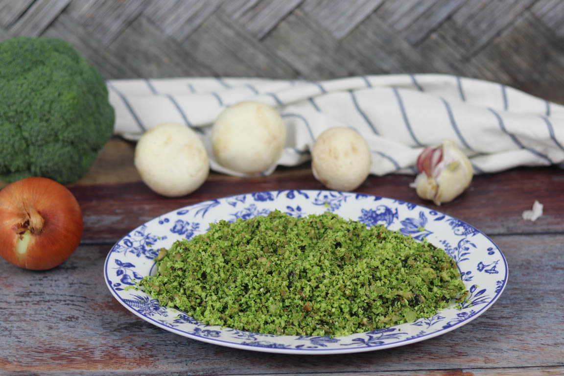 La receta de cuscús de brecol es una receta de falso cuscús. Y ¿por qué digo que es un plato de falso cuscús? Porque no estamos utilizando granos de cuscús en su elaboración sino que al picar las flores de brócoli conseguimos un efecto visual similar al cuscús pero en este caso como está elaborado con brécol tiene ese color verde tan característico.