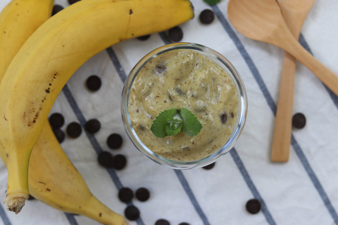 Receta para preparar un helado natural sin azúcar, sin gluten y sin lactosa. Para preparar un helado cremoso utilizamos como base el plátano congelado y lo aromatizamos con unas hojas de menta.