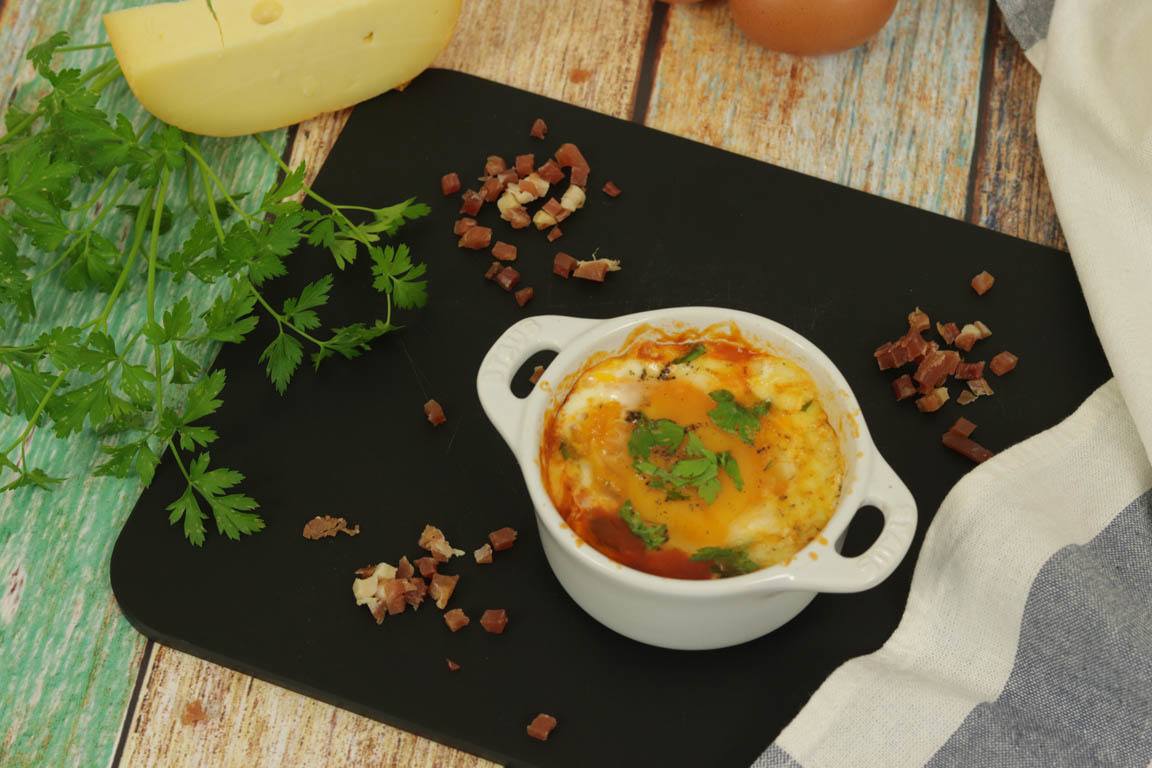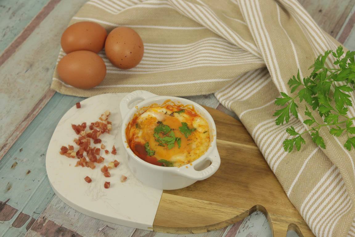 Los huevos al plato con jamón y salsa de tomate son una de las recetas más habituales. Puedes preparar los huevos al plato en una mini cocotte, en un ramequín o en cualquier otro recipiente que sea apto para cocinar en el microondas.