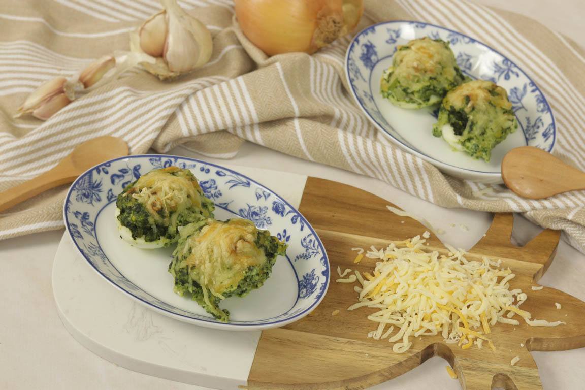 Los huevos rellenos de espinacas con bechamel puedes prepararlos sin gratinar y así aprovechas para calentar y gratinar al mismo tiempo. Esta receta de huevos rellenos con espinacas es una receta con un alto contenido en proteínas y resulta muy saciante por lo que la podemos utilizar como plato principal tanto en la comida como en la cena.