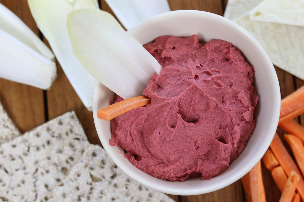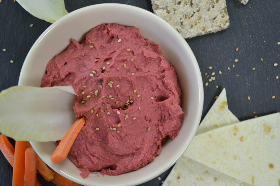 Receta de hummus fácil, rápido y saludable de garbanzos con remolacha y sin tahini. Las recetas de hummus son una manera diferente de consumir legumbres.
