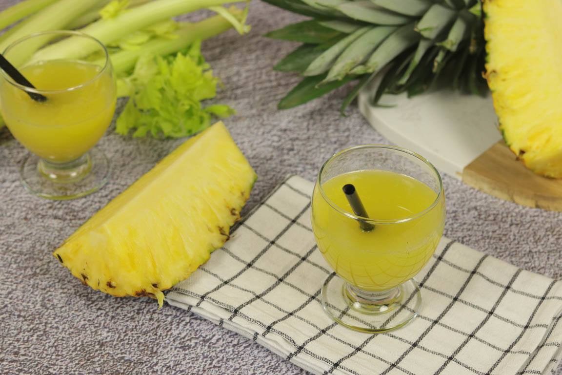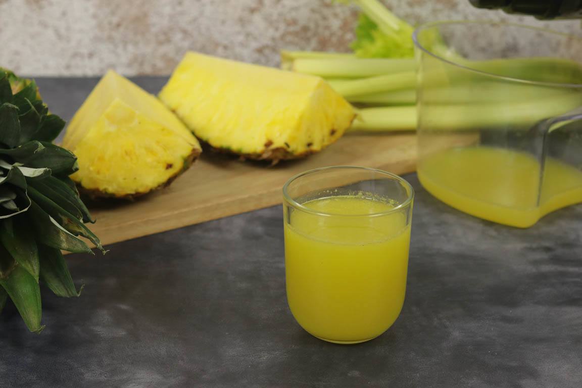 Los zumos preparados con el extractor de jugos son un concentrado de nutrientes, en especial vitaminas, minerales y sustancias bioactivas, pero al retirar toda la fibra del apio y de la piña también se concentran los azúcares de la piña.