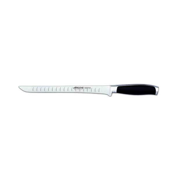 Para cortar jamón o piezas grandes de carne utilizo el cuchillo jamonero de Arcos de la serie Kyoto con un filo muy flexible. Este cuchillo jamonero de Arcos es de 25 cm y acero inoxidable forjado con alveolos que impide que los alimentos se queden adheridos a la carne lo cual resulta muy práctico.