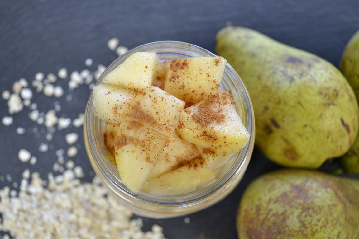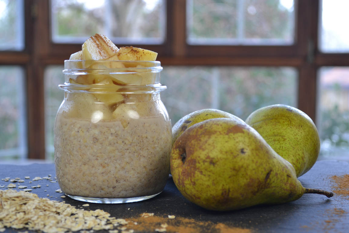 Es una receta que podemos dejar preparada la noche anterior y así a la hora del desayuno sólo hay que añadirle en este caso la pera. Los copos de avena de esta manera son mucho más fáciles de digerir.