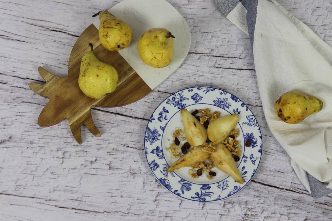 PERAS A LA PLANCHA CON PASAS Y NUECES