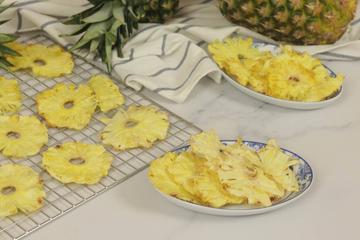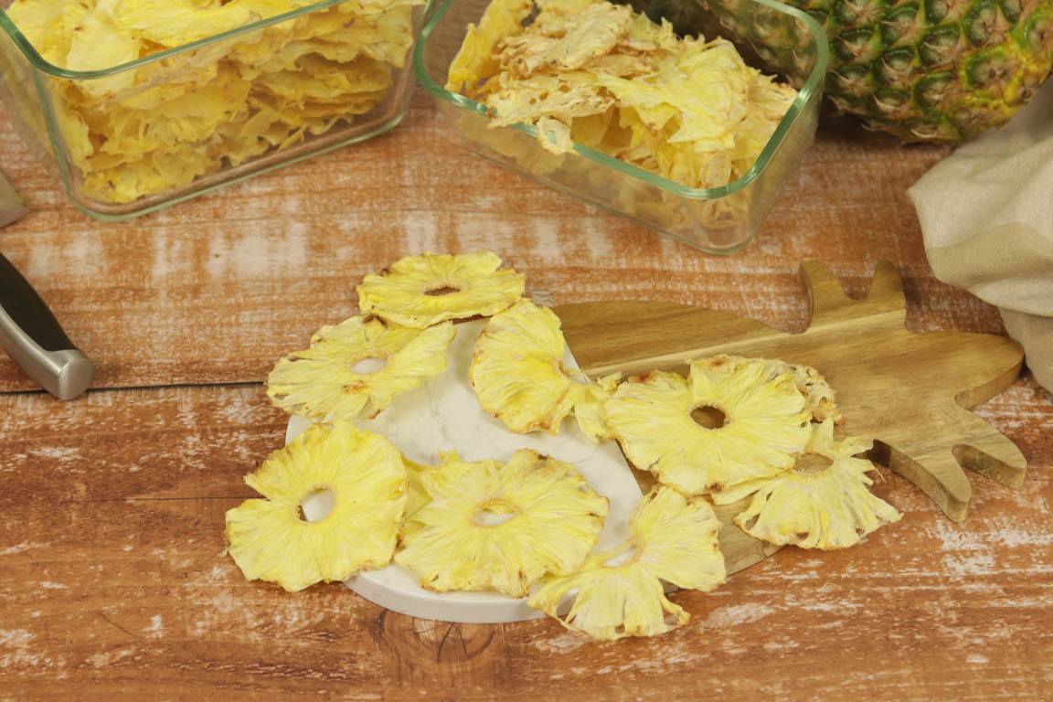 Al deshidratar la piña en una deshidratadora como la deshidratadora Kalahari nos va a quedar más crujiente que si lo hacemos en el horno ya que la deshidratadora va dejando salir el aire húmedo a medida que se va deshidratando la piña. Puedes utilizar también la piña deshidratada para dar un toque espectacular a tus postres o simplemente para acompañar tu granola casera.
