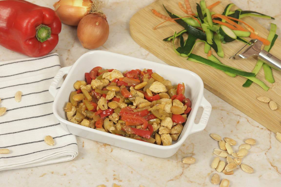 Las recetas orientales suelen tener bastante cantidad de verduras entre sus ingredientes. Para poder preparar por ejemplo un pollo con almendras, que es típico de la gastronomía china, se pueden utilizar ingredientes típicos de la dieta mediterránea, por lo que tenemos una fusión perfecta de ambas culturas.