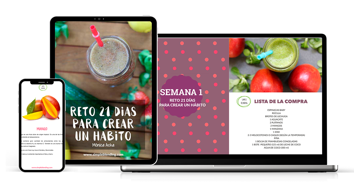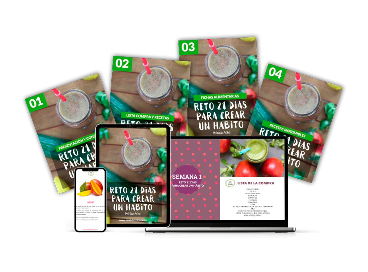 En mi Reto 21 días para crear un hábito encontrarás 21 recetas muy fáciles de tomar, una para cada día del reto. Por supuesto son recetas de batidos muy fáciles de preparar para que el Reto 21 días te resulte lo más fácil y llevadero posible. Con mis consejos no te llevará más de 5 minutos al día preparar las recetas.