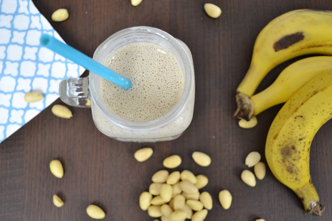 Receta de batido protéico de plátano con mantequilla de almendras. Este smoothie tiene un alto contenido en proteínas de alto valor biológico que provienen de la leche y de la chía. Ambos ingredientes contienen todos los aminoácidos esenciales.