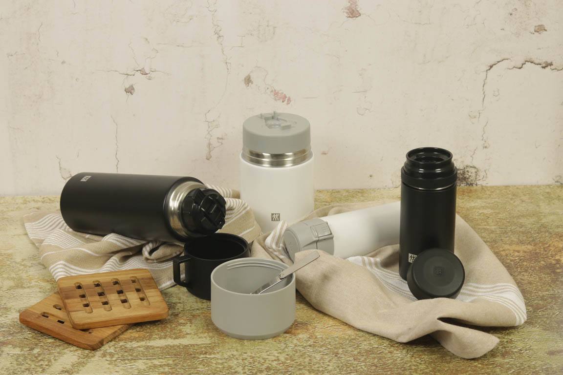 Y en este caso, Zwilling tiene además un termo de líquidos, con un tamaño un poco más pequeño, diríamos que de ración específico para llevar infusiones calientes o algo que a mí me gusta mucho en época de calor que son las aguas infusionadas bien fresquitas, con limón, frutos rojos o con hierbas aromáticas. Este termo dispone de un colador incorporado que permite filtrar el agua antes de beberla. Todo un lujo.
