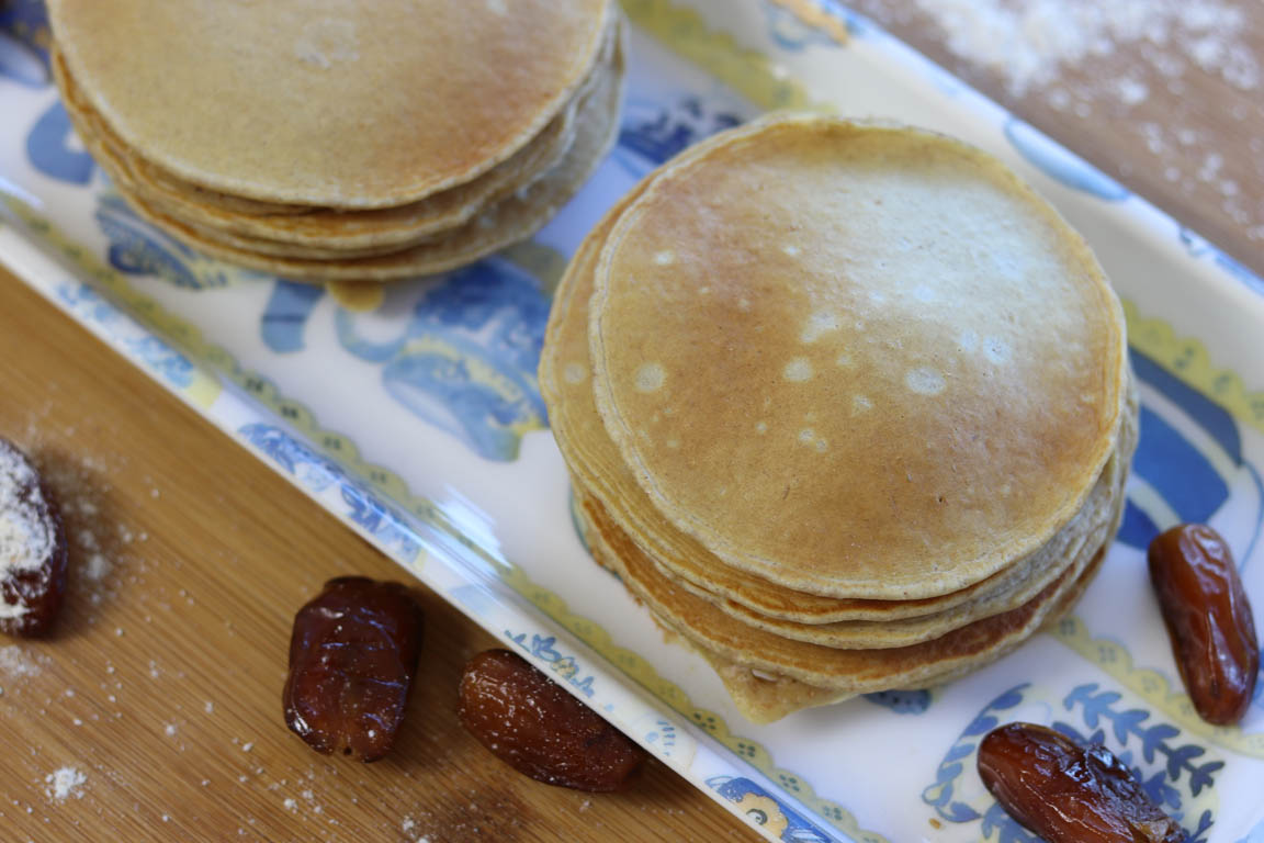 Receta para preparar unas deliciosas tortitas con harina integral y sin azúcar añadido, utilizando caramelo de dátil como endulzante.