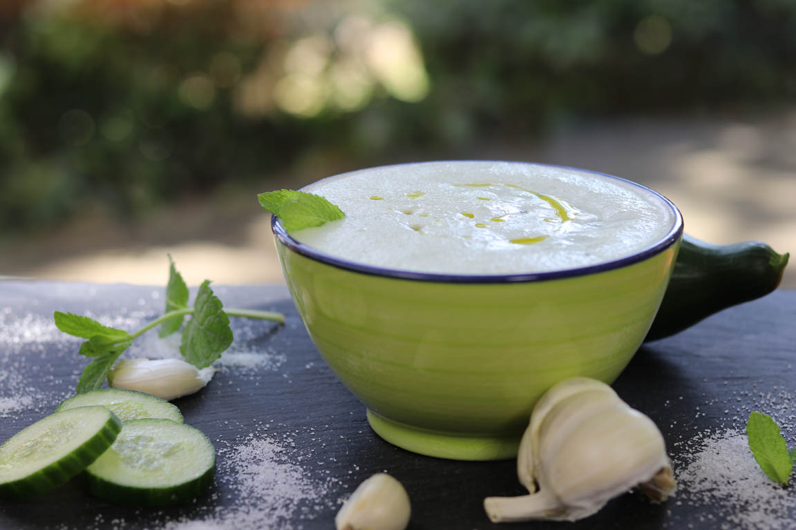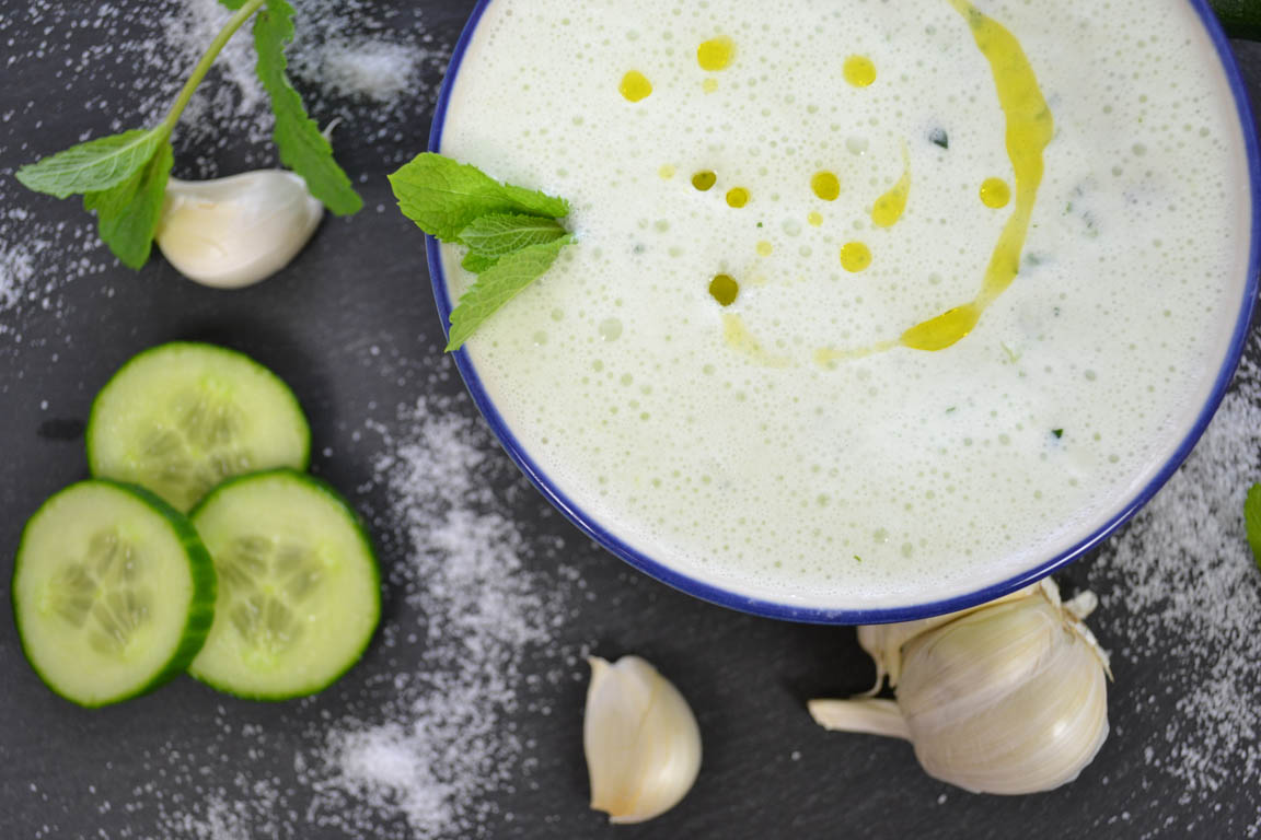 Receta de tzatziki griego de yogur y pepino que podemos tomar como aperitivo o como salsa o aliño para una ensalada de tomate. Al añadirle yogur griego conseguimos un aporte extra de proteínas.