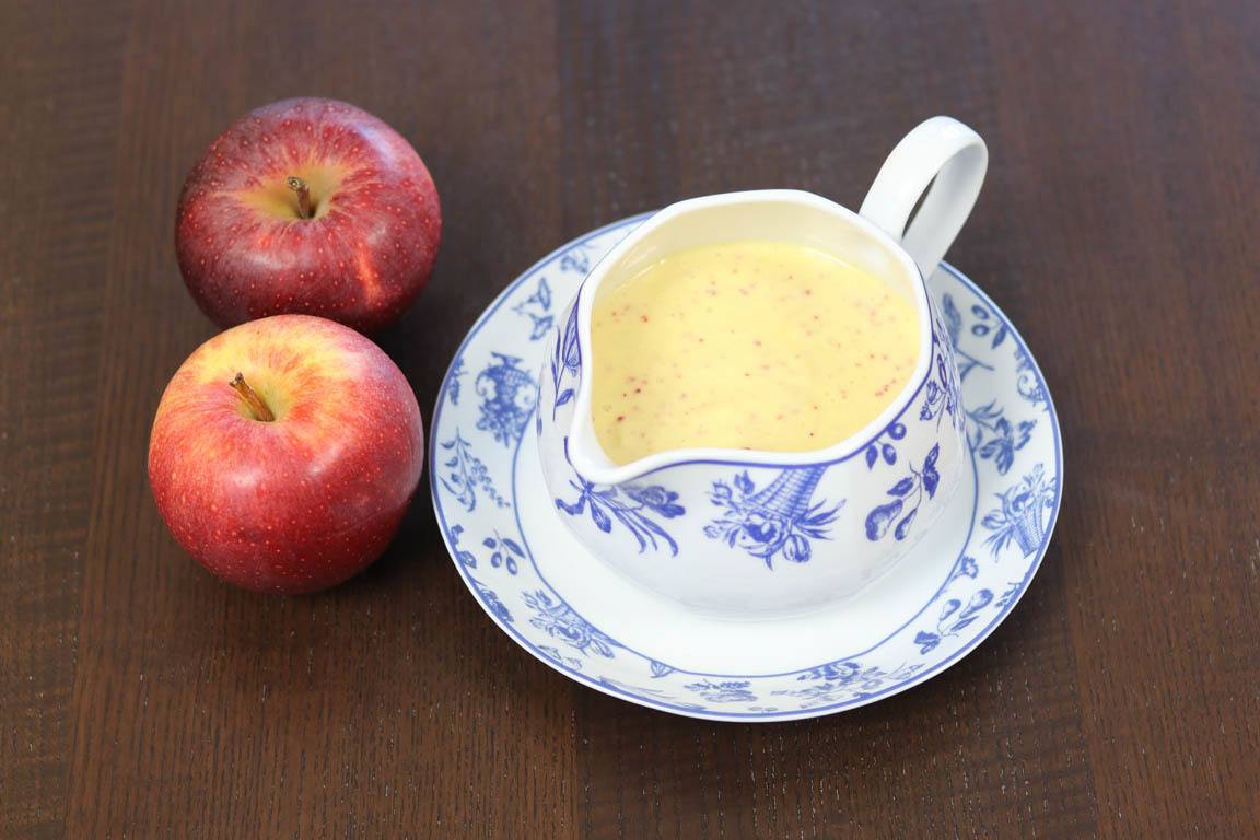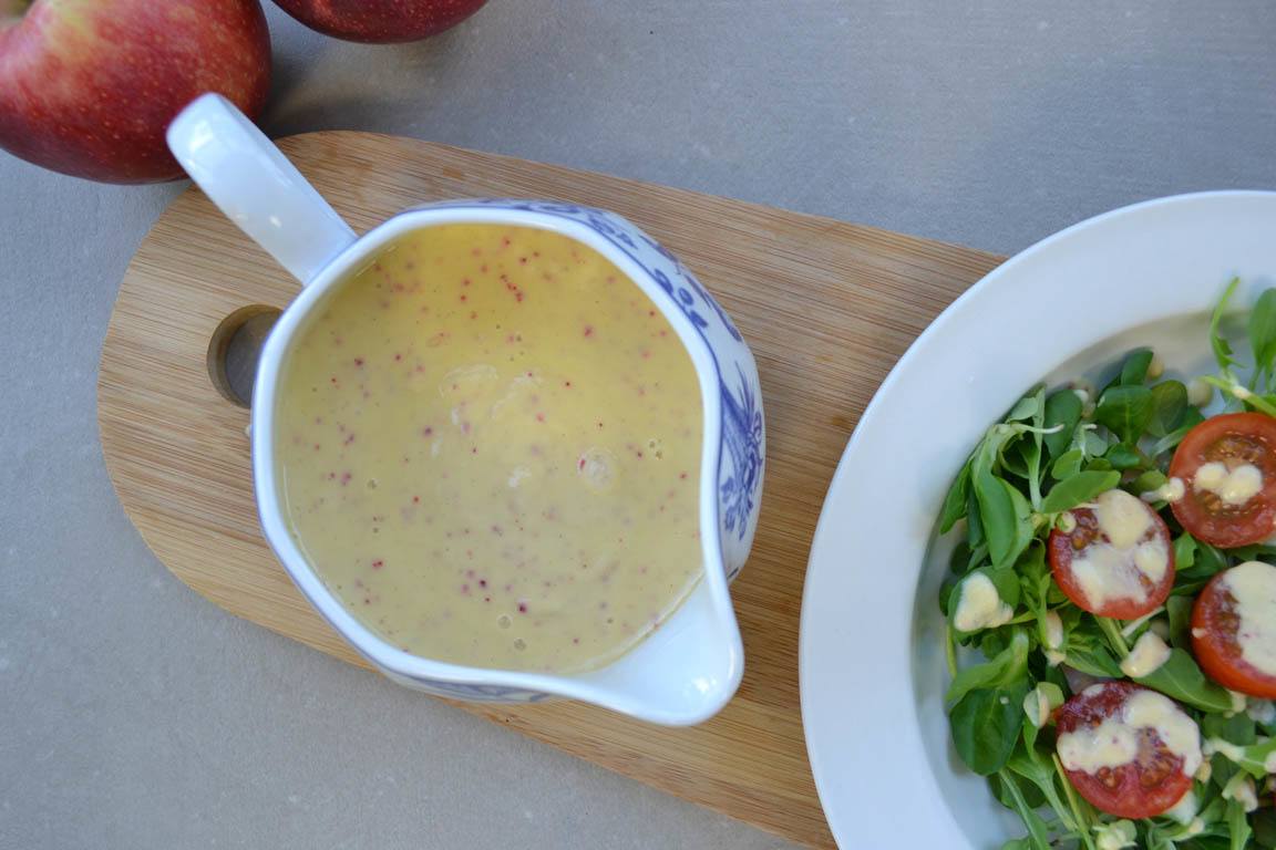 Receta de vinagreta de manzana para aliñar ensaladas y poder sustituir el uso de salsas comerciales que contienen azúcar añadido y grasas menos saludables, por aderezos elaborados en casa con ingredientes naturales.