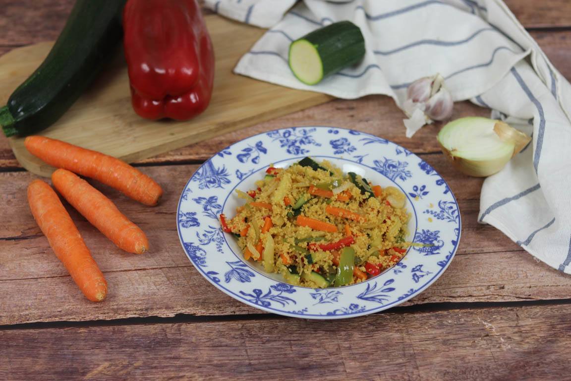 La combinación de cuscús con verduras cocinadas en el wok es rápida y fácil de preparar. Probablemente lo más largo de esta receta es trocear las verduras.